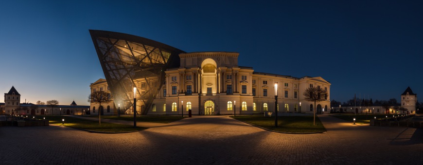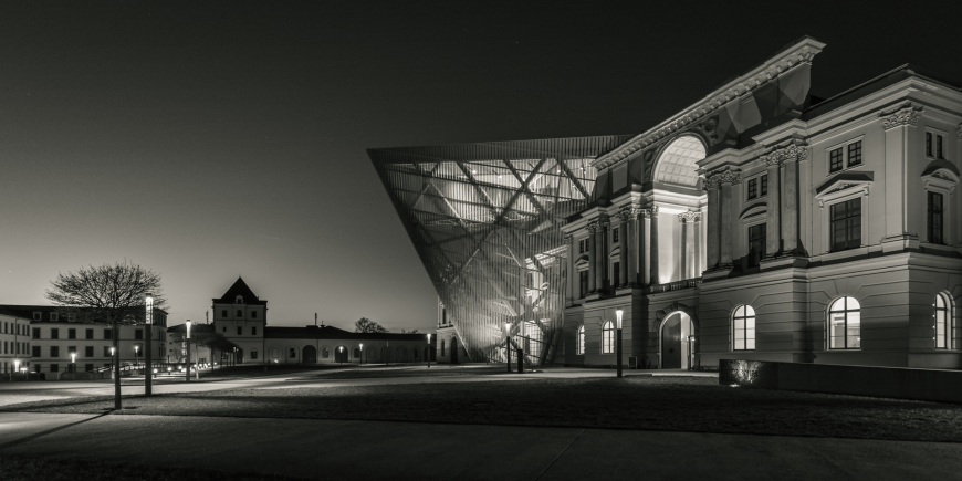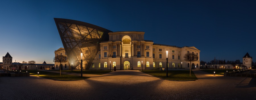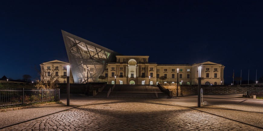 180° Panorama des Militärhistorischen Museums in Dresden. Das Gebäude entstand als Arsenalhauptgebäude von 1873 bis 1877 am Olbrichtplatz in der Dresdner Albertstadt. Ab 1914 diente es als Sächsisches Armeemuseum, zwischen 1940 und 1945 als Herresmuseum und von 1972 als Armeemuseum der DDR. 1994 wurde es das Zentrale Museum der Bundeswehr.