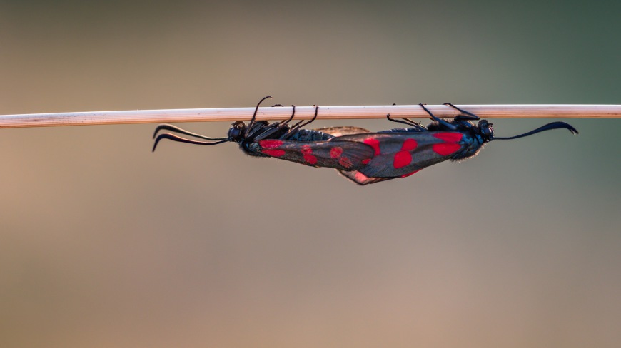 Das Bild zeigt die Hochzeit der Bluttröpfchenfalter oder Widderchen. Sie gehören zur Familie der Schmetterlinge.