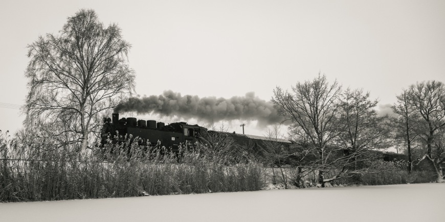 Personenzug P3008 von Radebeul Ost nach Radeburg bei der Überquerung des Dippelsdorfer Teiches bei Kilometer sieben der 16,6 km langen Schmalspurstrecke. Gezogen wurden die 10 Personenwagen von Baureihe 99 1789-9.