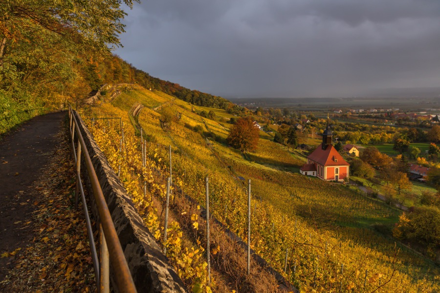 ... erstrahlen die Weinberge mit der Weinbergkirche in Pillnitz in den schönsten Herbst Farben.
