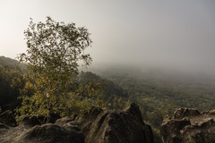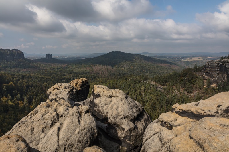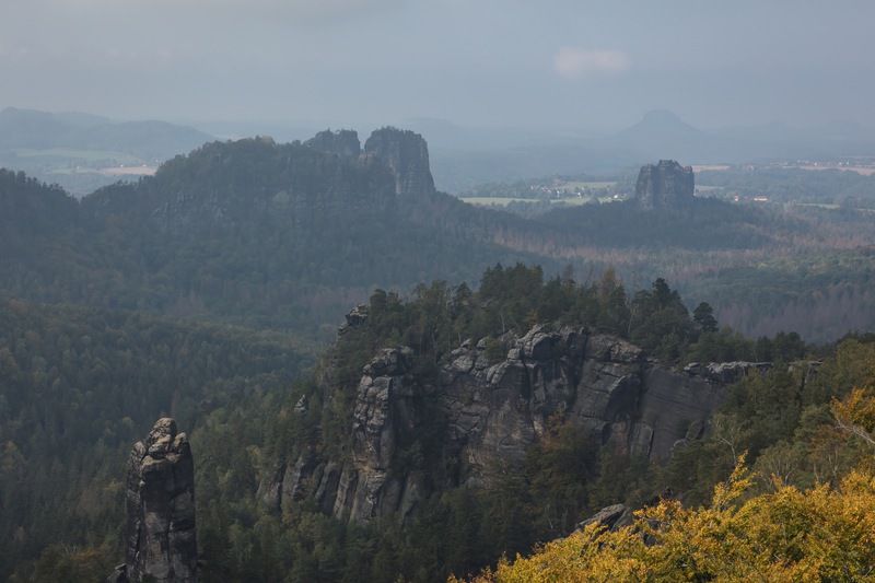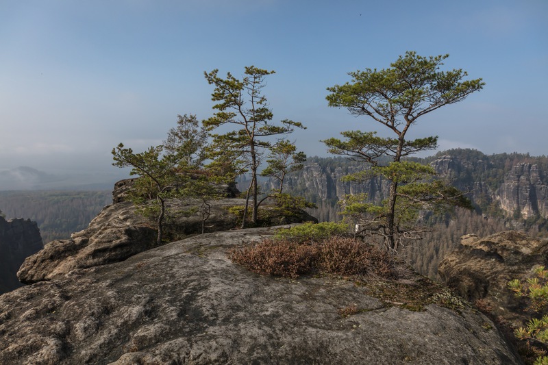 Start war Punkt 9:00 Uhr in Schmika auf dem Pakplatz an der Elbe. Zwei weitere Autos standen dort und das deutete auf eine Wanderung ohne viel Publikum hin. Also los. Erste Hürde war ohne etwas zu kaufen an der Bäckerei vorbeizukommen. Wir konnten widerstehen. Am Ende von Schmilka sind wir nach rechts auf den Grenzweg angbogen und bis zur Kipphornaussicht bergauf gelaufen. Sicht gleich null, da sich der Hochnebel noch nicht verzogen hatte. Weiter in Richtung Carolafelsen. Dort angekommen hatte sich das mit der Ruhe erledigt. Ab sofort Wanderer auf Schritt und Tritt. Irgendeiner hatte zum Sturm auf die Sächsische Schweiz geblasen. Kurz geschaut und weiter zum Domerker und über die Breite Kluft zur kleinen Bastei. Wer diese besuchen möchte sollte das bald tun, denn sonst ist sie mit Kierfern und Birken zugewachsen. Dann Abstieg zum Parkplatz. Alles voll. In den alten Bundesländern muss es sich rumgesprochen haben wie schön das Elbsandsteingebirge ist ...