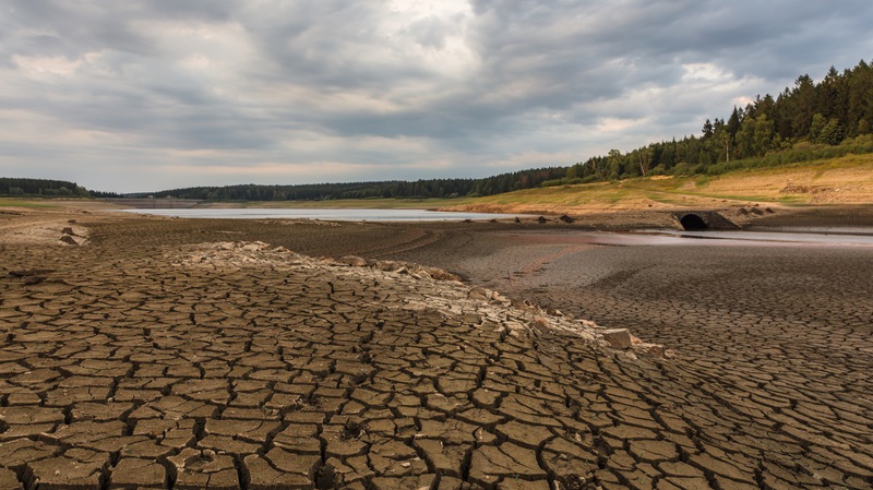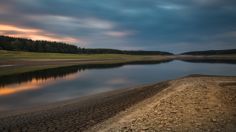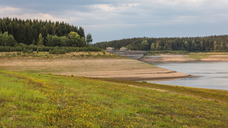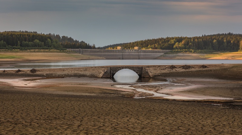Die Bilder zeigen die Talsperre Ende August 2018. Die lange Dürre hat den Wasserstand rapide sinken lassen, so das eine alte Mühle und die Brücke samt Baumstümpfe sichtbar wurden. Dies ist erst ab ca. 30% Wasserstand zu beobachten und trat zu letzt 1975 auf.