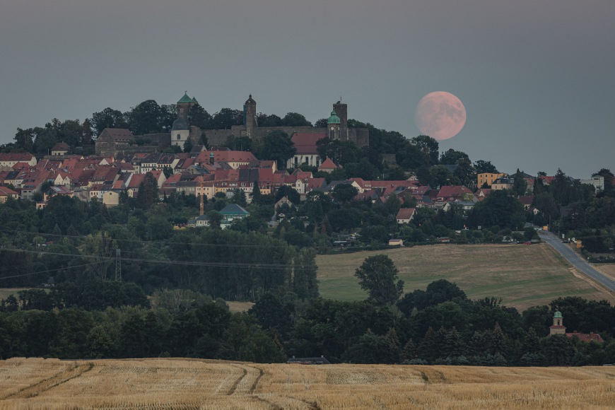 ... waren vom letzten Supermond 2022 am 10. August über der Burg Stolpen zu sehen.